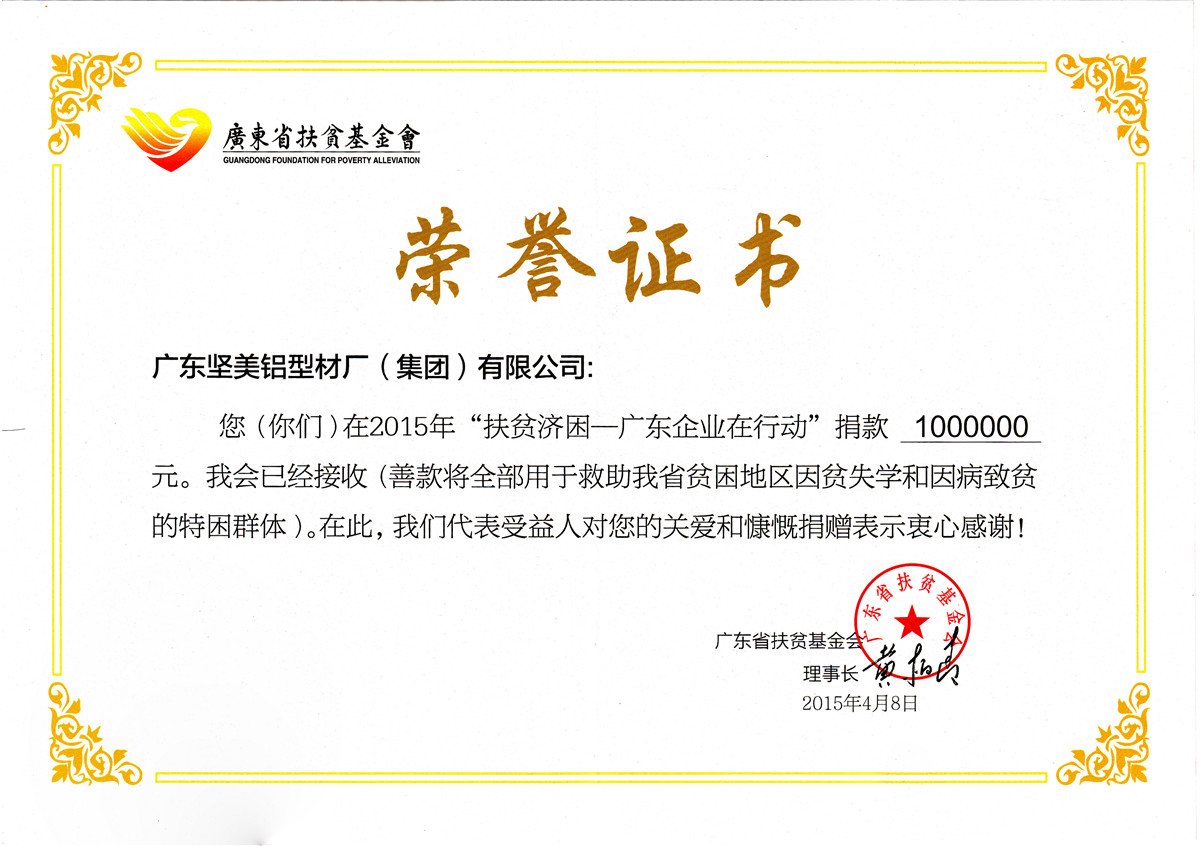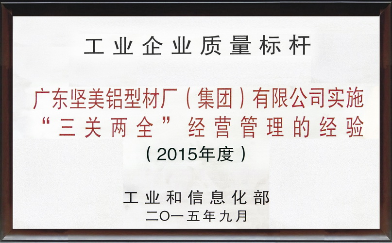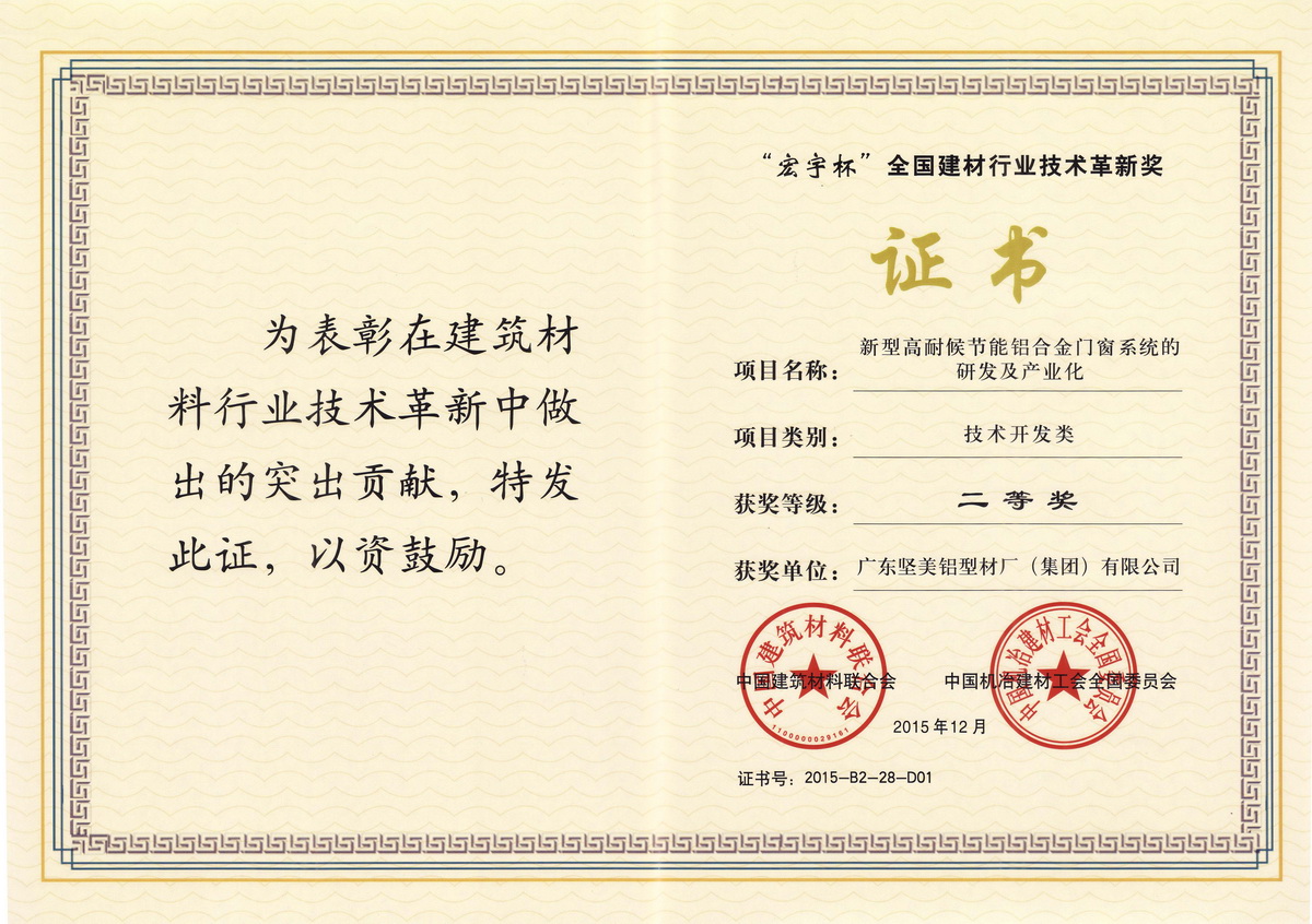 2015年12月 “宏宇杯“全國建材行業技術革新獎二等獎:新型高耐候節能鋁合金門窗系統的研發及產業化:廣東堅美 (中國建筑材料聯合會)