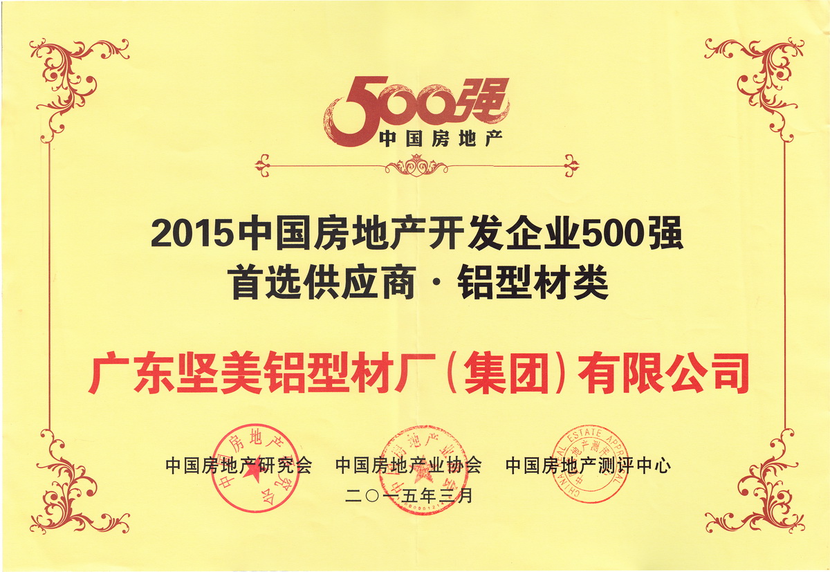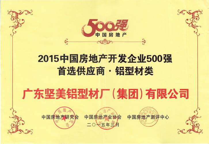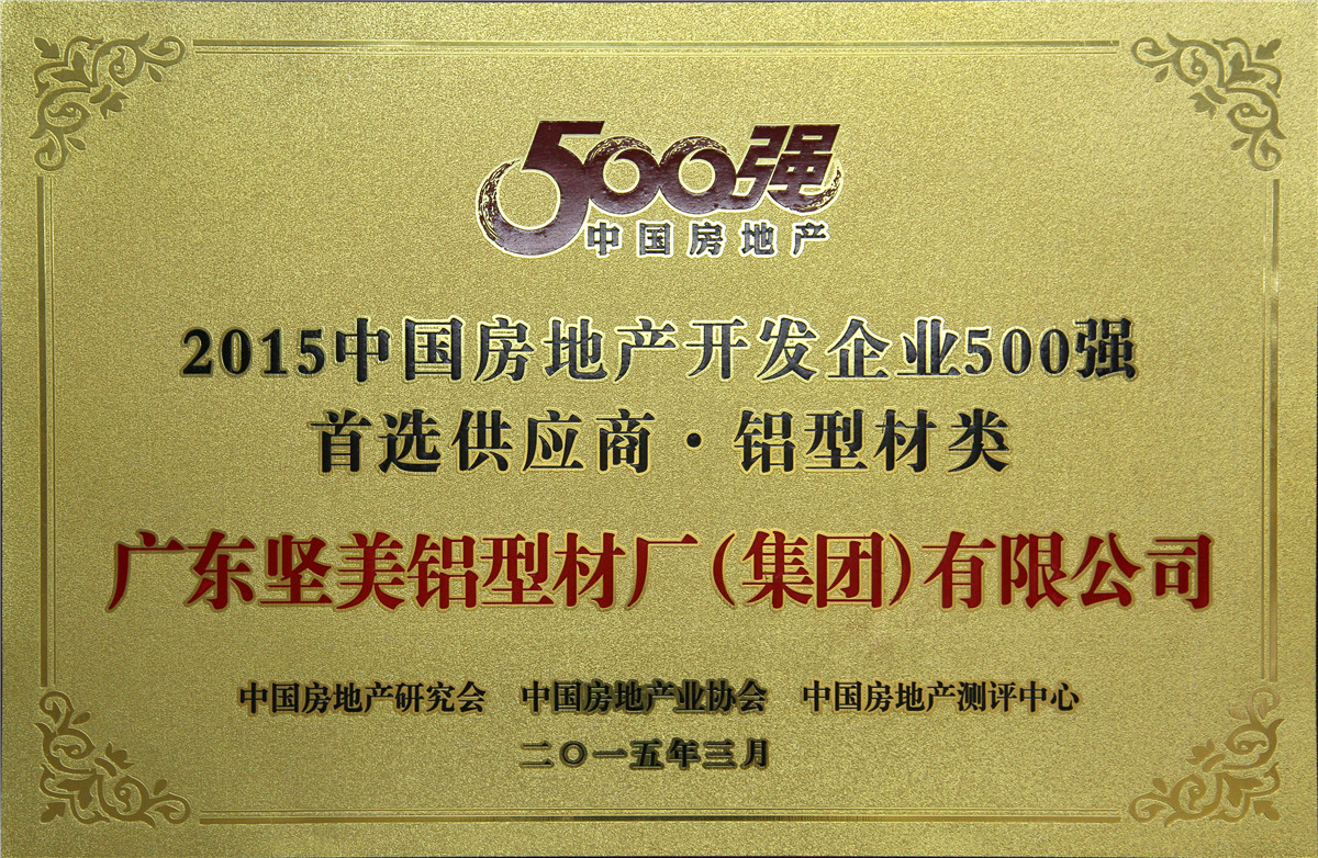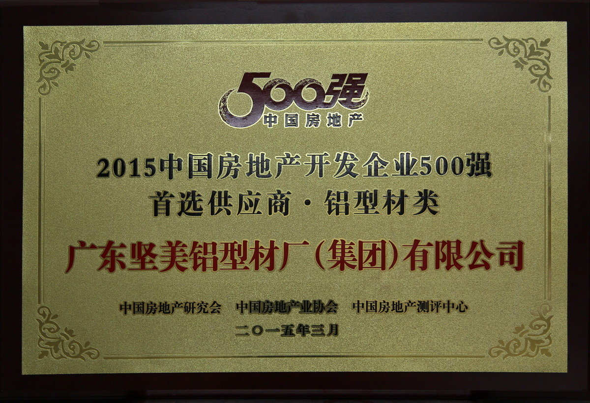 2015年3月 2015中國房地產開發企業500強首選供應商鋁型材類牌匾:廣東堅美 (中國房地產業協會)