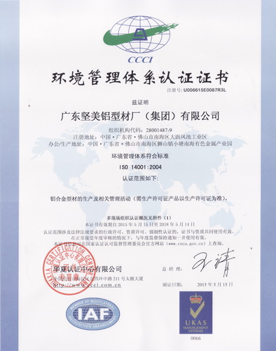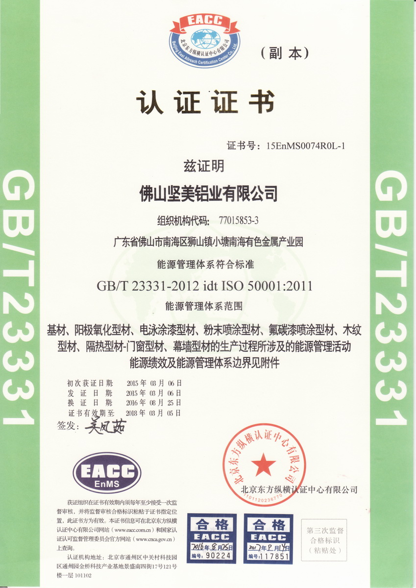2015年3月 能源管理體系符合標準GB T 23331-2012 idt ISO 50001:2011:能源管理體系范圍:佛山堅美 (北京東方縱橫認證中心)