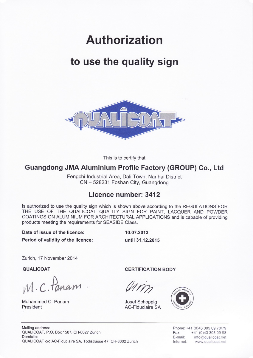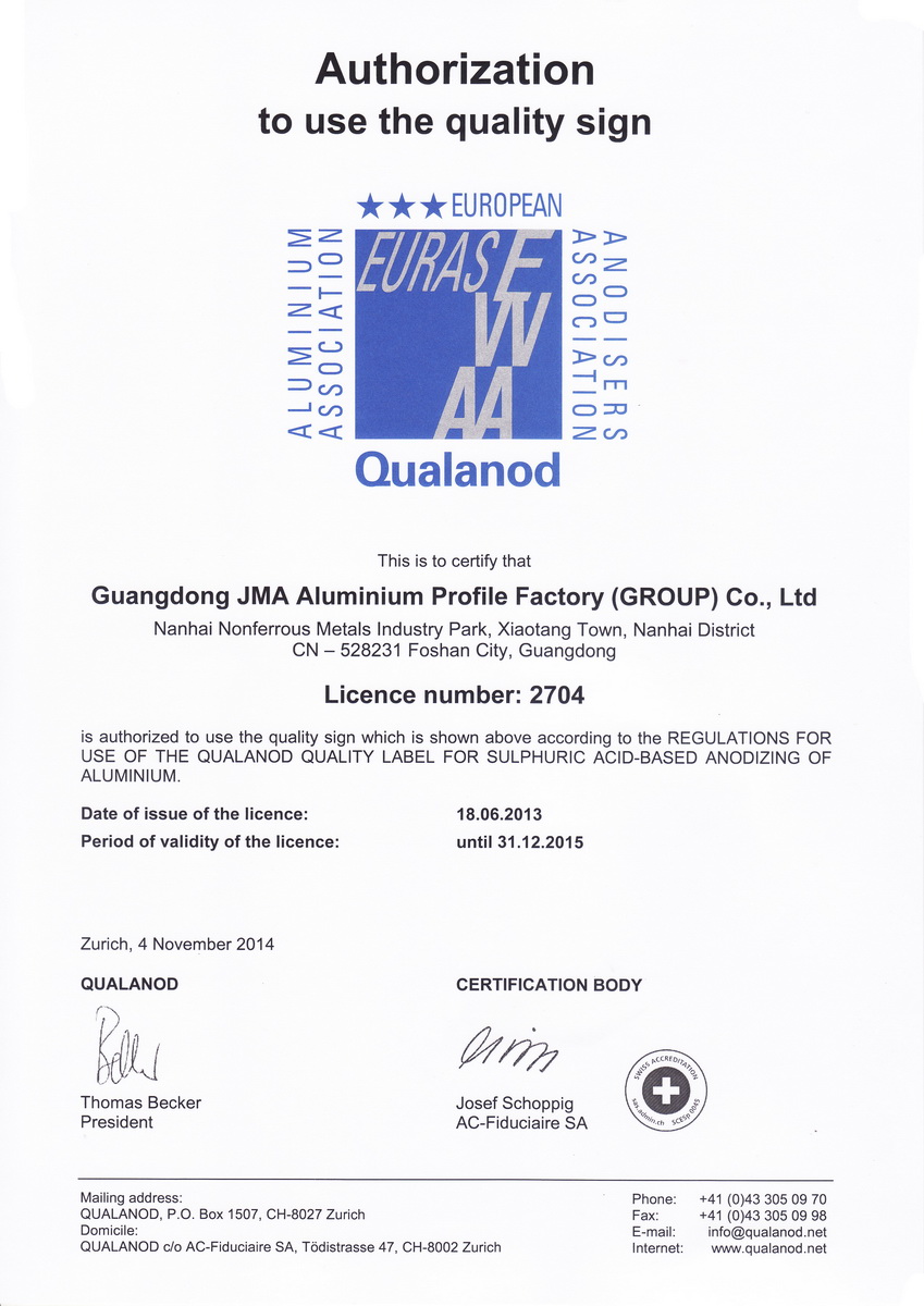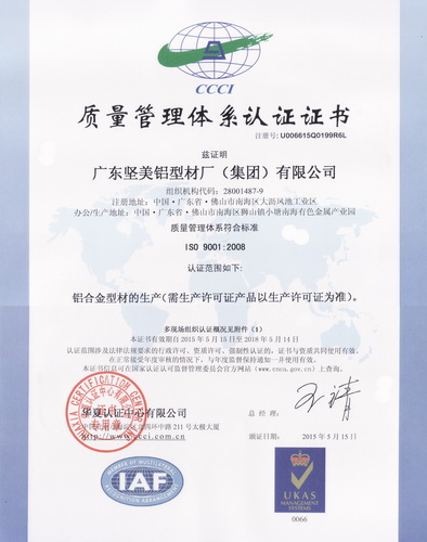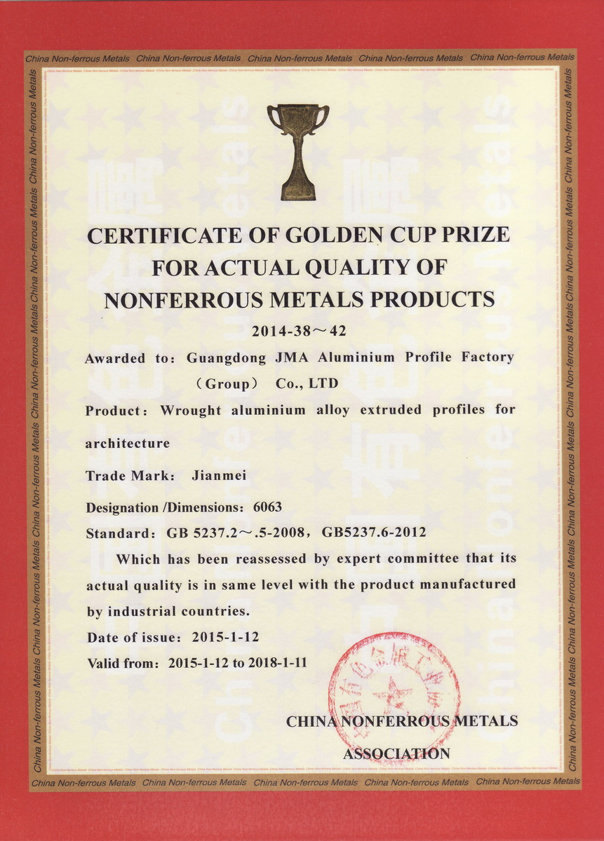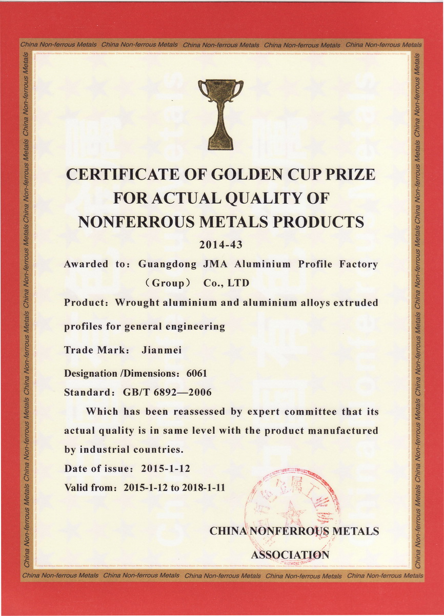 2015年1月 有色金屬產品實物質量金杯獎證書2011-43:一般工業鋁及鋁合金擠壓型材:廣東堅美 (中國有色金屬工業協會)英文版
