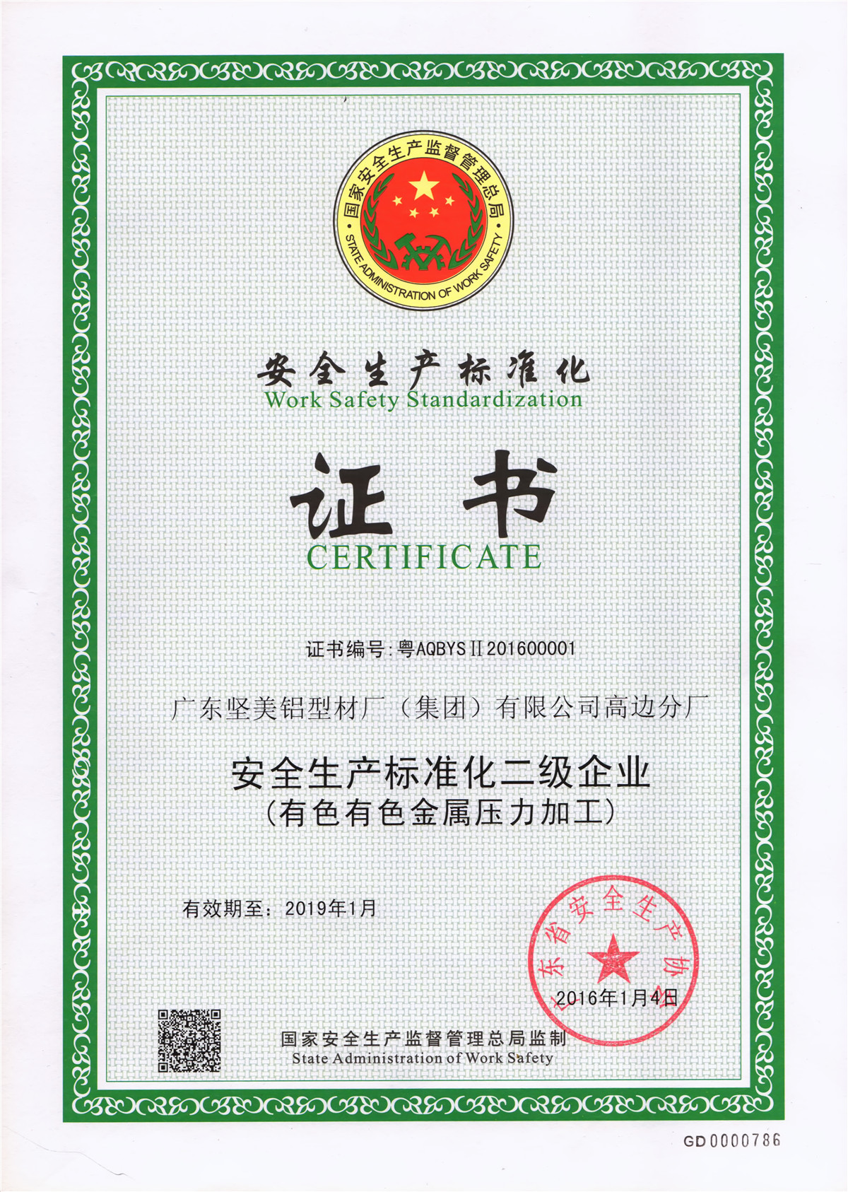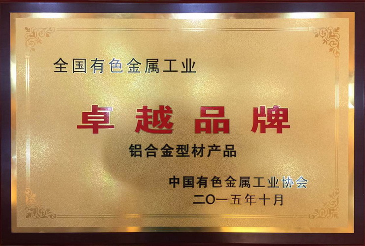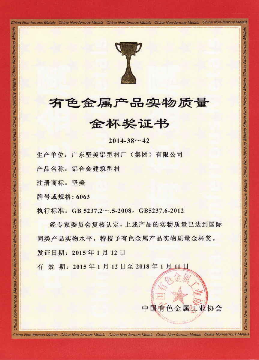 2015年1月 有色金屬產品實物質量金杯獎證書2011-43:一般工業鋁及鋁合金擠壓型材:廣東堅美 (中國有色金屬工業協會)中文版