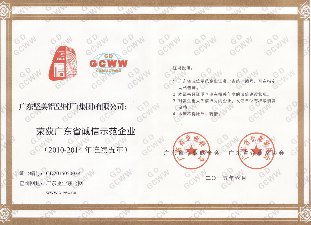 2015年6月 2010-2014連續五年廣東省誠信示范企業:廣東堅美 (廣東省企業聯合會)