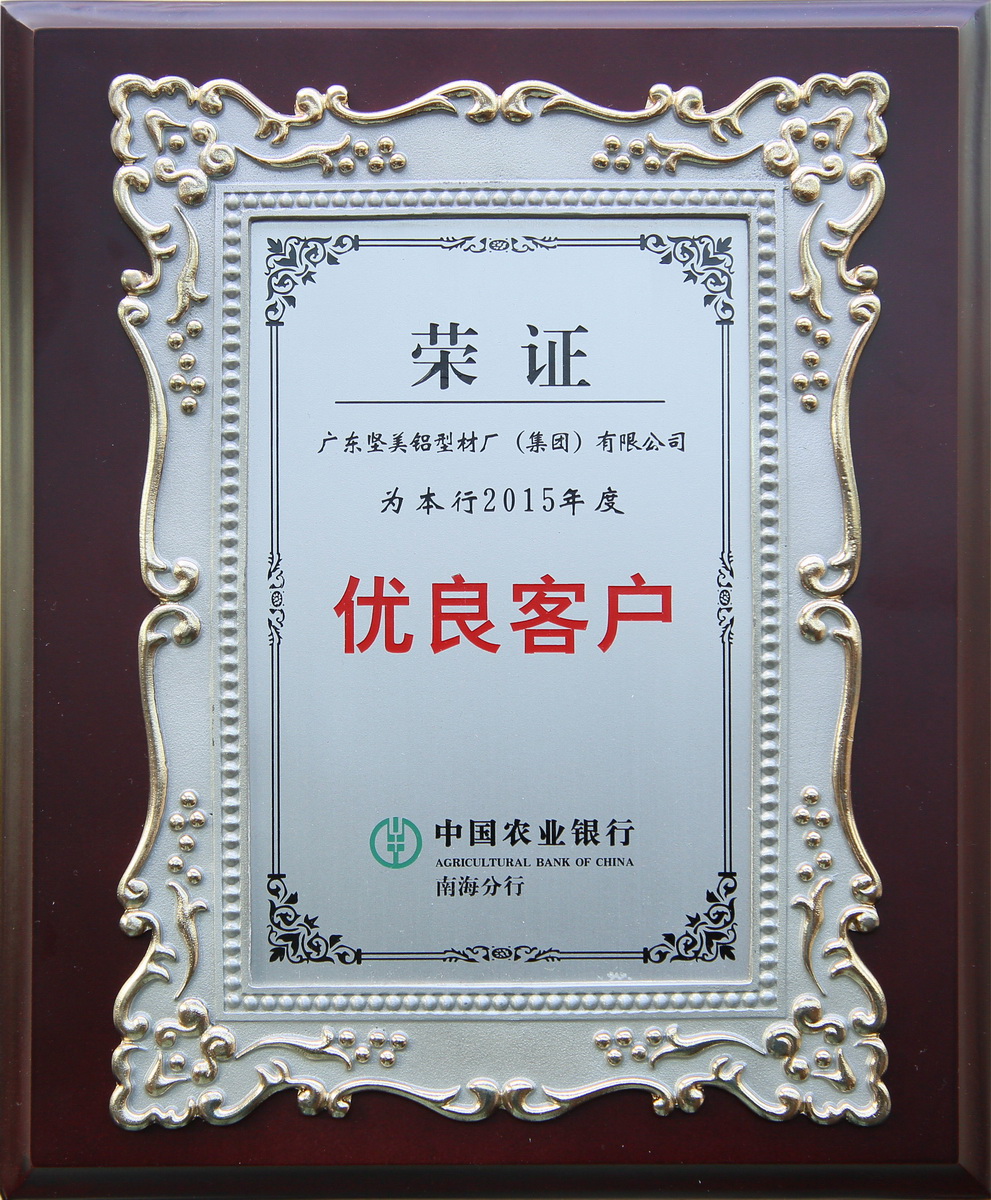 2015年 2015年度優良客戶獎牌:廣東堅美 (中國農業銀行南海分行)