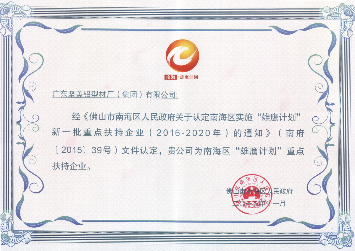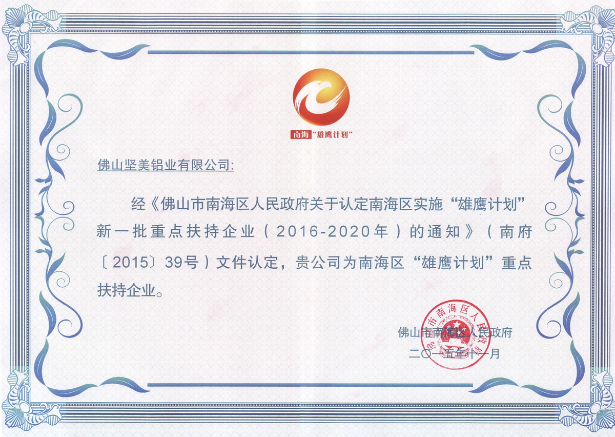 2015年11月 “雄鷹計劃”重點扶持企業證書:廣東堅美 (佛山市南海區人民政府)