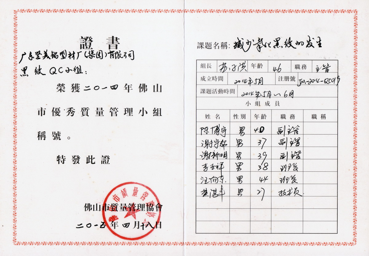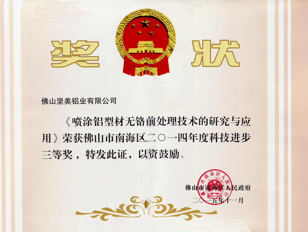 2015年11月 南海區2014年度科技進步三等獎:噴涂鋁型材無鉻前處理技術的研究與應用:佛山堅美 (佛山市南海區人民政府)