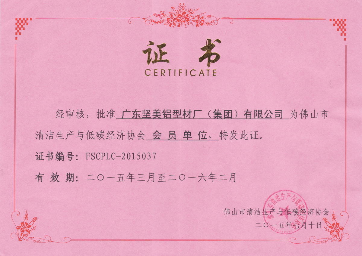 2015年7月 佛山市清潔生產與低碳經濟協會會員單位證書:廣東堅美 (佛山市清潔生產與低碳經濟協會)
