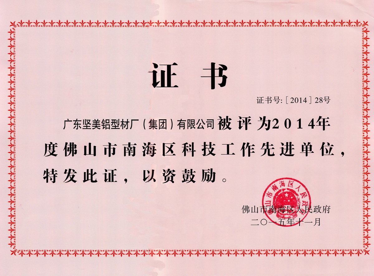 2015年11月 2014年度佛山市南海區科技工作先進單位 :廣東堅美 (佛山市南海區人民政府)