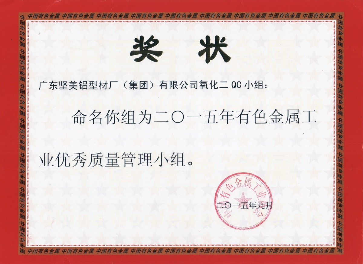 2015年9月 有色金屬工業優秀質量管理小組獎狀:廣東堅美 (中國有色金屬工業協會)