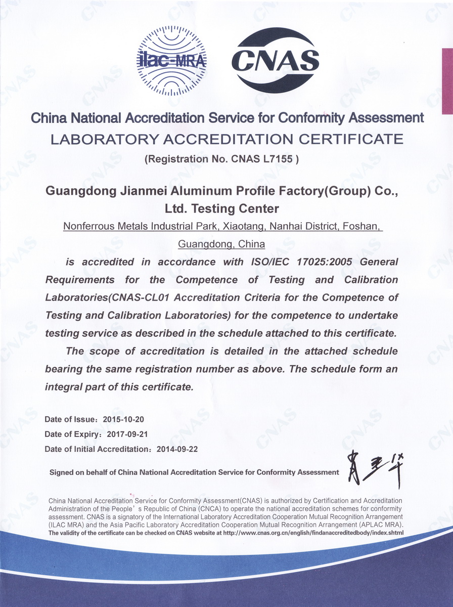 2015年10月實驗室認可證書:廣東堅美 (中國合格評定國家認可委員會)