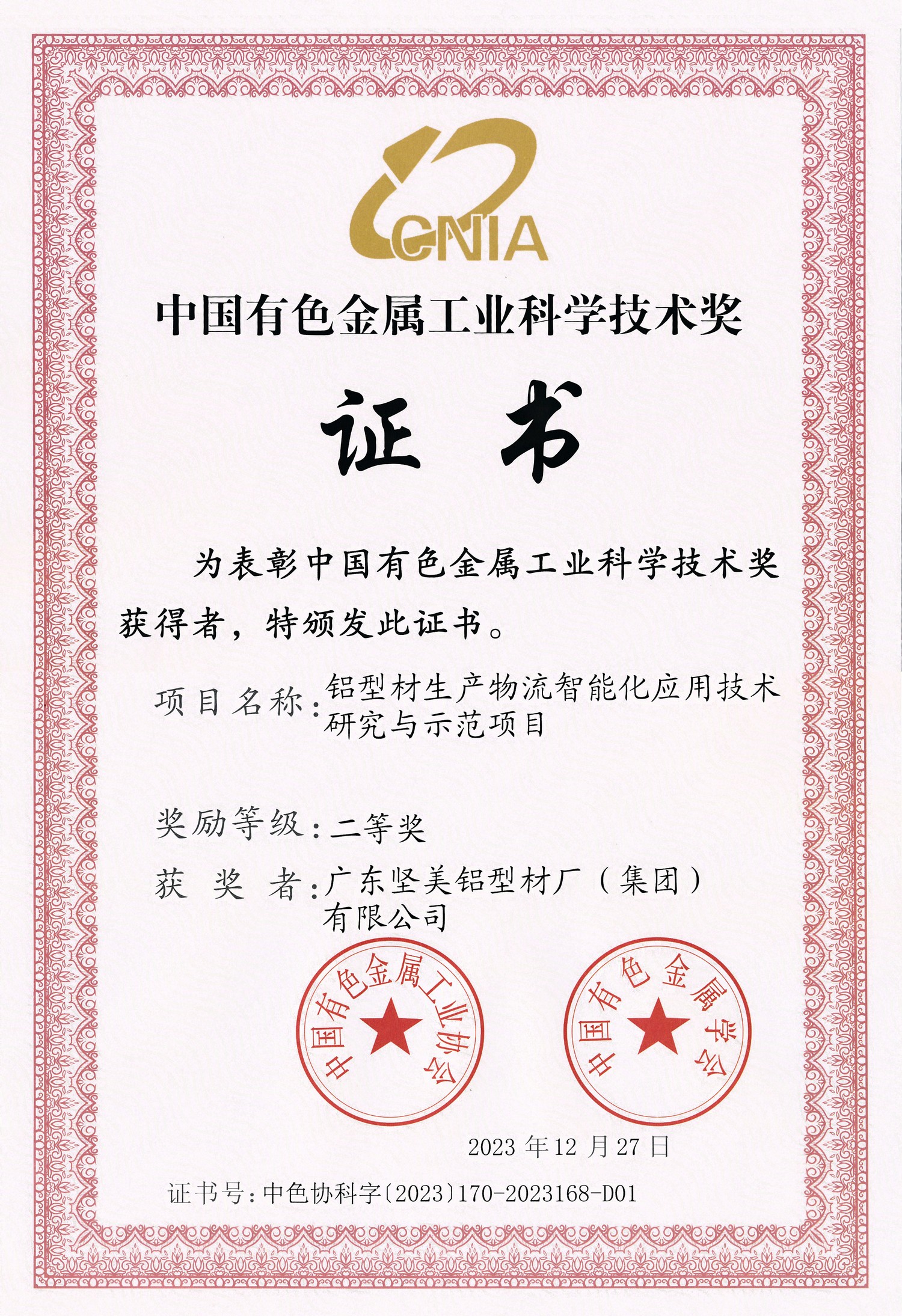 • 2023年12月27日 中國有色金屬工業(yè)科學(xué)技術(shù)獎二等獎:鋁型材生產(chǎn)物流智能化應(yīng)用技術(shù)研究與示范項(xiàng)目:廣東堅(jiān)美(中國有色金屬工業(yè)協(xié)會)