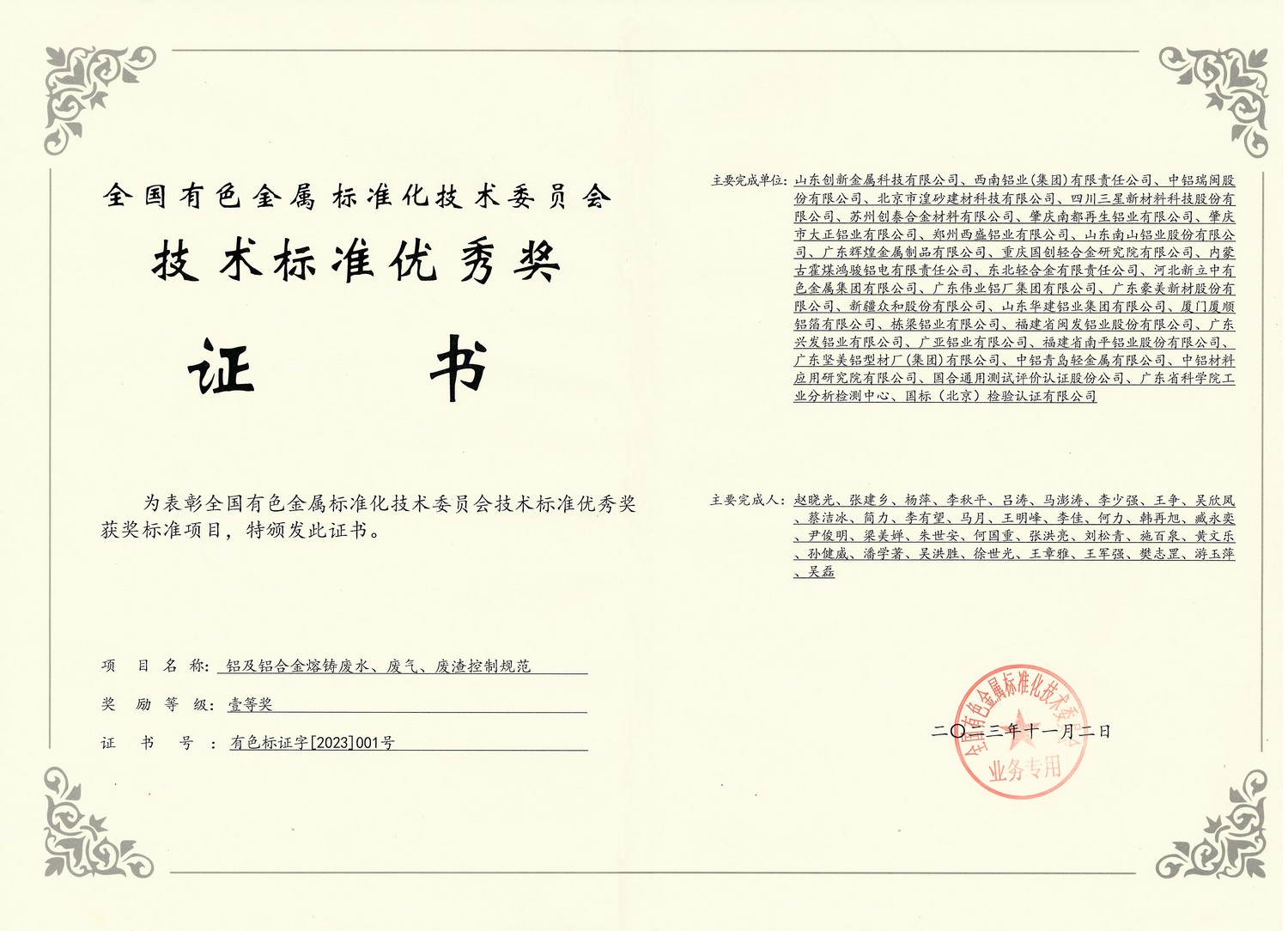 • 2023年11月2日 技術(shù)標(biāo)準(zhǔn)一等獎-鋁及鋁合金熔鑄廢水、廢氣、廢渣控制規(guī)范(全國有色金屬標(biāo)準(zhǔn)化技術(shù)委員會)