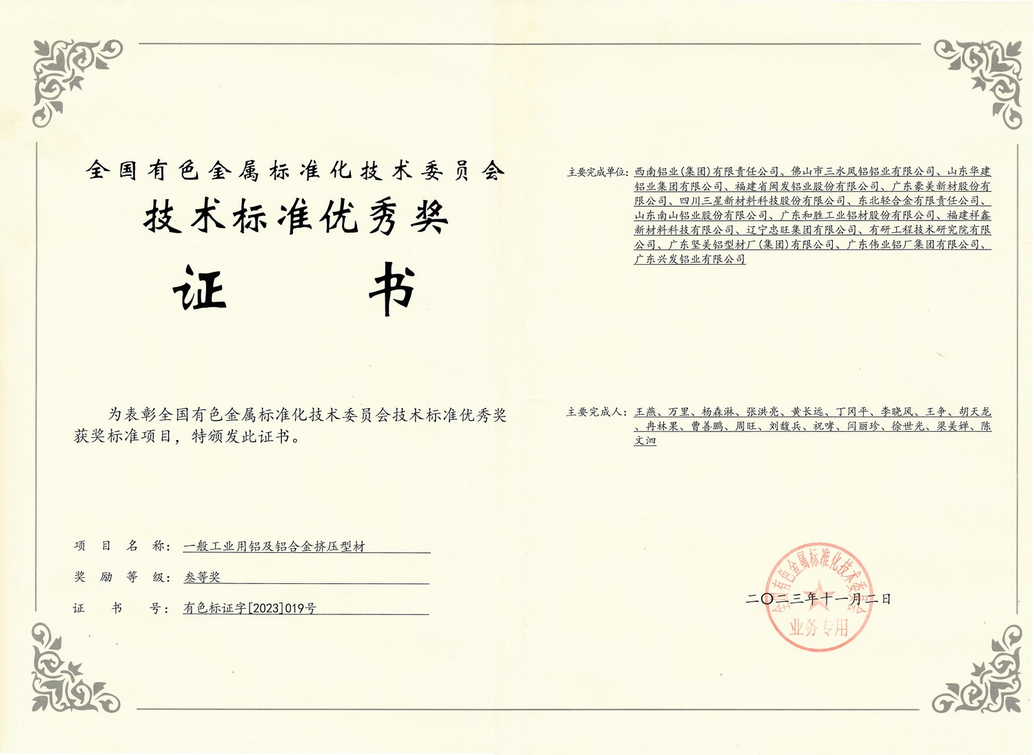 • 2023年11月2日 技術(shù)標(biāo)準(zhǔn)三等獎-GB一般工業(yè)用鋁及鋁合金擠壓型材(全國有色金屬標(biāo)準(zhǔn)化技術(shù)委員會)