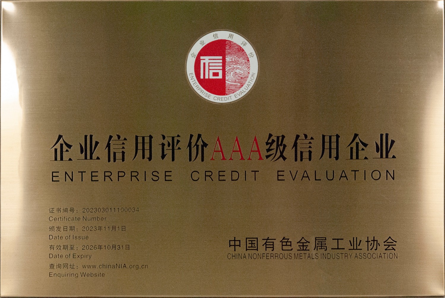 • 2023年11月1日 中國有色金屬工業(yè)協(xié)會 企業(yè)信用評價(jià)AAA級信用企業(yè)