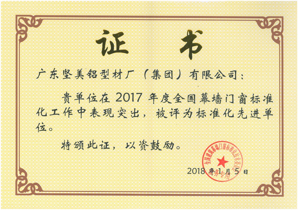2018.1月 標(biāo)準(zhǔn)化先進(jìn)單位證書:廣東堅(jiān)美(全國(guó)建筑幕墻門窗標(biāo)準(zhǔn)化技術(shù)委員會(huì))