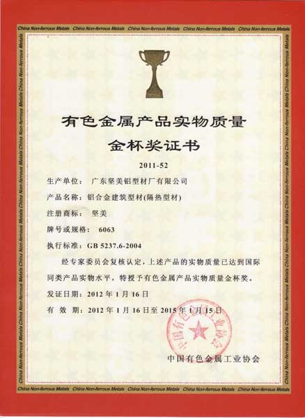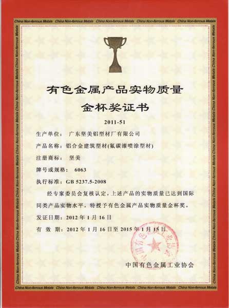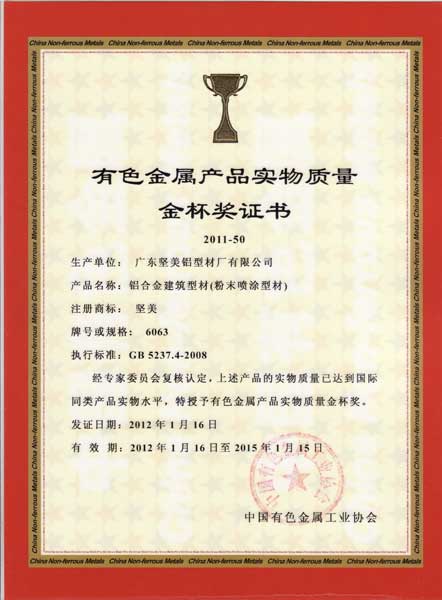 • 2011年有色金屬產品實物質量金杯獎