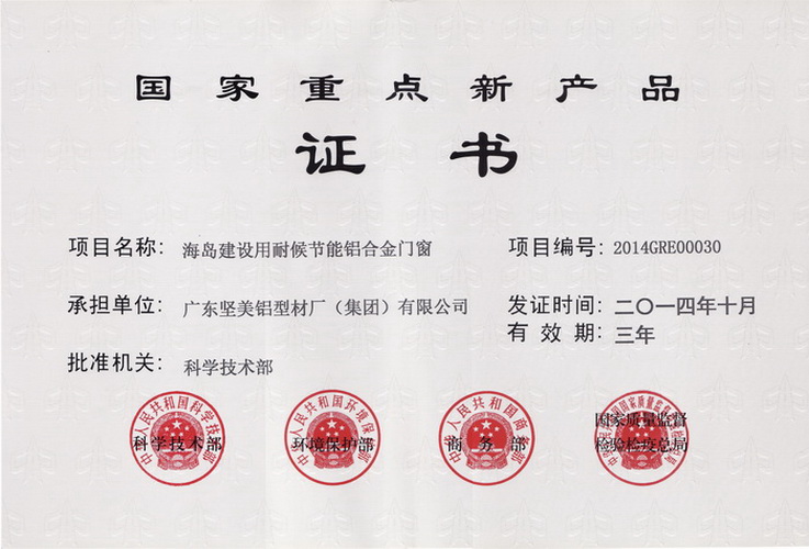 • 國家重點新產(chǎn)品(海島建設(shè)用耐候節(jié)能鋁合金門窗)