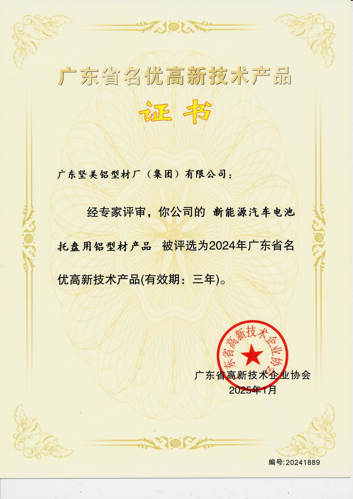 • 2025年1月 2024年廣東省名優高新技術產品:新能源電池托盤用鋁型材產品