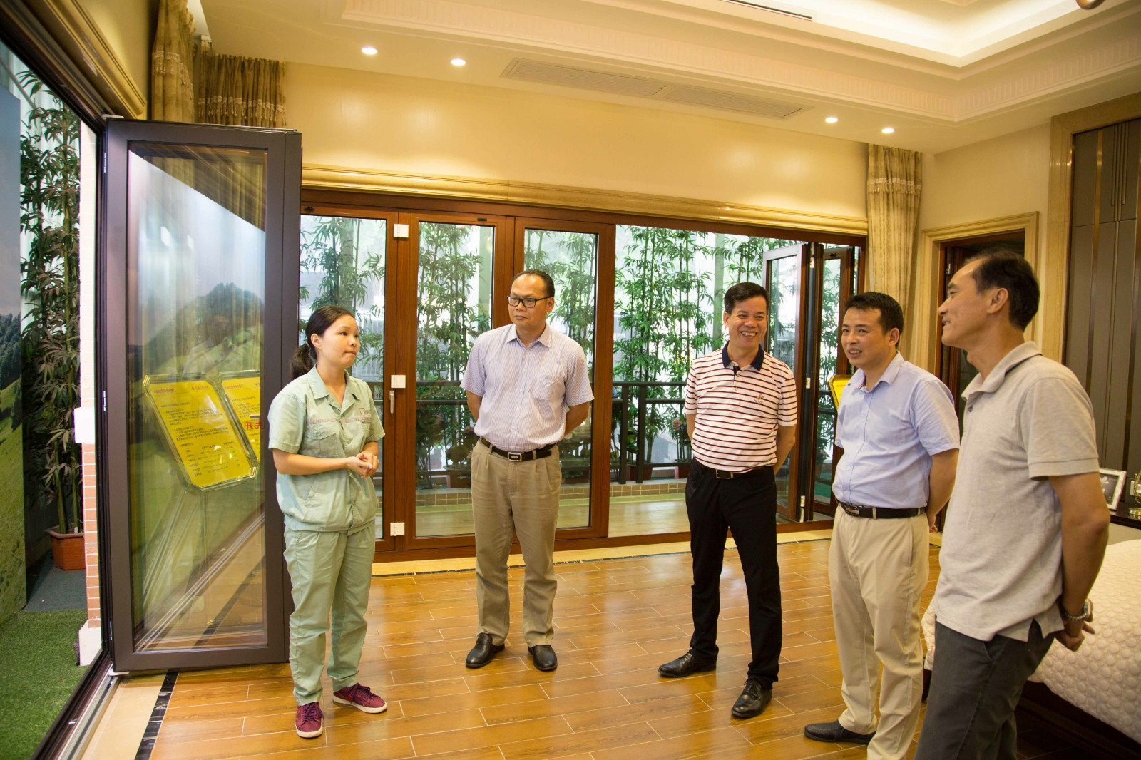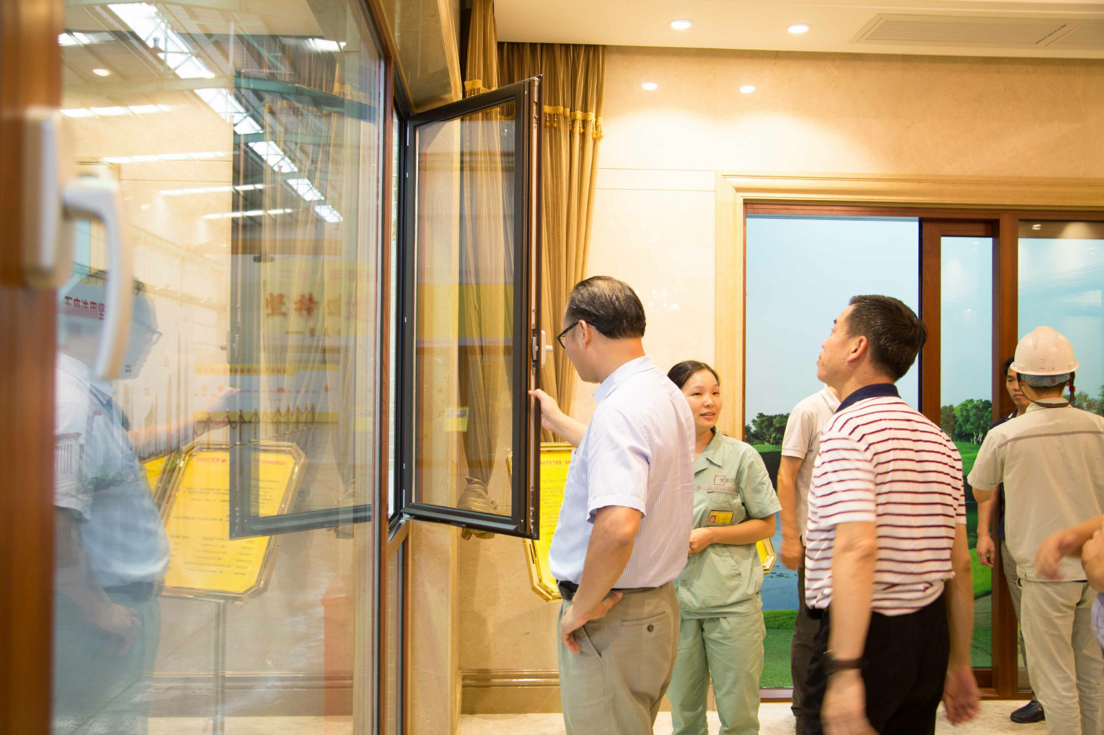 考察團一行在體驗系統門窗